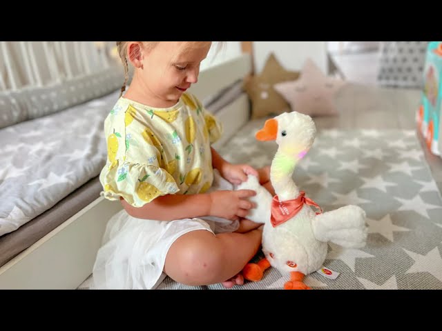 Ta gąska czuje rytm jak mało kto! Naciśnij na przycisk z nutką, znajdujący się na jej brzuchu, aby podziwiać jak tańcuje, trzepocząc skrzydłami i kręcąc podświetloną na kolorowo szyją. Gęś mówi w języku polskim, więc zabawi malucha nie tylko tańcem, ale też wesołymi zwrotami, które wypowiada. Dodatkowo, wyposażona jest także w funkcję nagrywania, a za jej aktywowanie odpowiada drugi przycisk, z ikonką mikrofonu. Po nagraniu dowolnego dźwięku, gęś odtworzy dźwięk, modyfikując jego brzmienie.