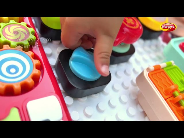 Domek stworzony z myślą o miłośnikach klocków i zręcznościowych niespodzianek! W zestawie znajdziemy dużą płytkę z wypustkami – ściankę domku, do której można przypiąć klocki z motorycznymi zadaniami. Na małe paluszki czeka wiatraczek do obracania, zasuwki do przesuwania, klamerka do zapinania, element do przekręcania i wiele więcej! Dach domku wyposażony został nie tylko w praktyczny uchwyt do przenoszenia zabawki, ale także w dźwiękowy panel z mini pianinkiem i miejscem na przypięcie jednego z dwóch aktywnych klocków – z dzwoneczkiem lub lampką. Dodatkowo znajdziemy tu też trybiki do przekręcania. To jeszcze nie wszystko! Poza domkiem i klockami, w skład zestawu wchodzi też pojazd z miejscami do przypięcia ulubionych, zręcznościowych klocków, żeby mogły one towarzyszyć maluchowi podczas podróży, dbając o sprawność jego paluszków.