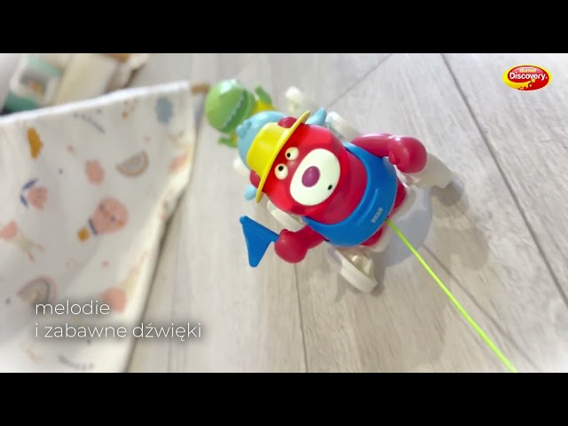 Pociąg z trzema wesołymi pasażerami czeka na przejażdżkę! Zabawka wyposażona jest w sznureczek do prowadzenia rączką. Podczas jazdy, zwierzaki kołyszą się na boki, podobnie jak kółeczka pojazdu, które ozdobione są wzorkiem, przez co ich poruszanie się wywołuje ciekawy efekt wizualny. Pociąganie za sznureczek uruchamia zabawne dźwięki i melodie, które umilą zabawę.
